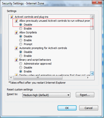 c) Script ActiveX controls marked as safe for scripting – Enabled
