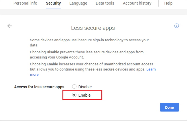 2. Click on “Settings” behind“Access for less secure apps”, then choose “Enable”.