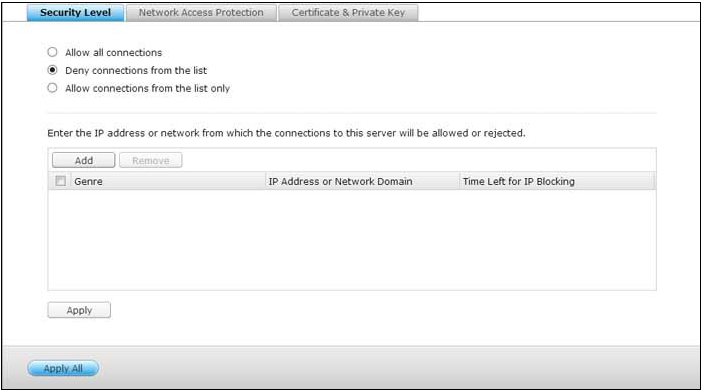 Specify the IP address or the network domain from which the connections to the NAS are allowed or denied. When the connection of a host server is denied, all the protocols of that server are not allowed to connect to the NAS.After changing the settings, click "Apply" to save the changes. The network services will be restarted and current connections to the NAS will be terminated.