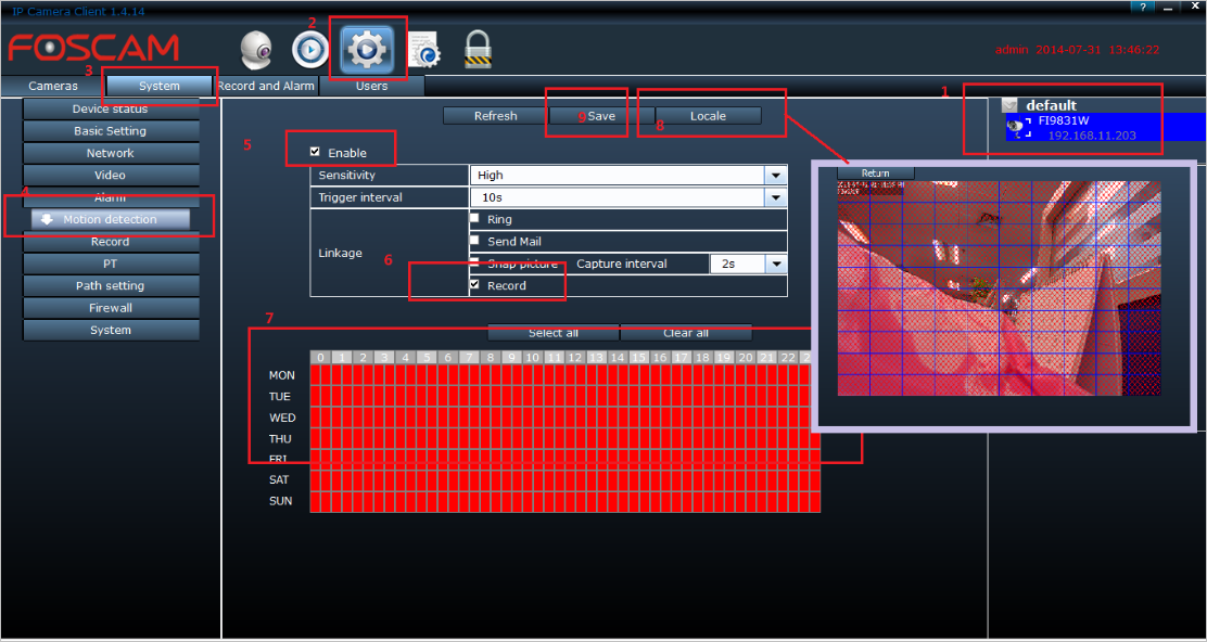 See the Picture 1, ① click “Enable” firstly, ② check “Record” for alarm action, ③ set your alarm schedule, and ④ set your motion detection area. Do not forget to click on “Save” after you finish settings.