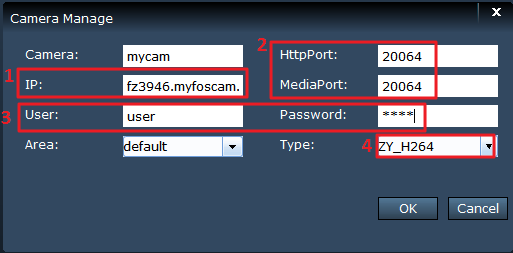 Please enter camera’s WAN IP/DDNS, port, user and password of your camera in the pop up window. Remember to click OK to save the settings.